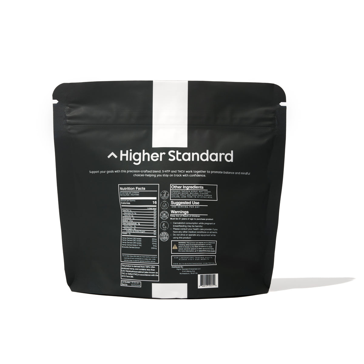 Cannabidiol Isolate (20mg). Supports balance within the endocannabinoid system and helps moderate overstimulation, reinforcing clarity and control.
